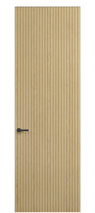 SELECT — коллекция минималистичных дверей с фрезеровкой по натуральному шпону. Рельеф на поверхности полотна создаёт игру света и тени, добавляя пространству динамичности и визуального объёма. Двери SELECT в сочетании со стеновыми панелями и мебельными фасадами, повторяющими лаконичный дизайн, создают единое стилевое решение.